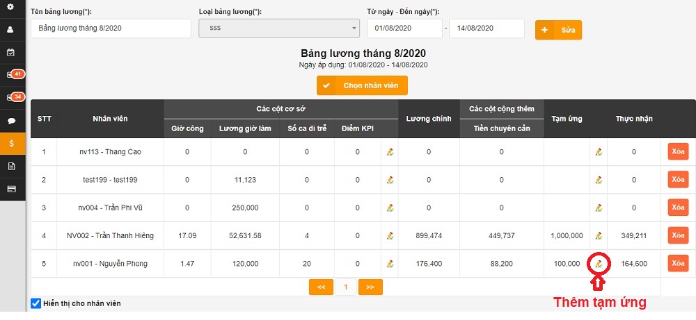 Tạo tạm ứng cho nhân viên trên từng bảng lương.