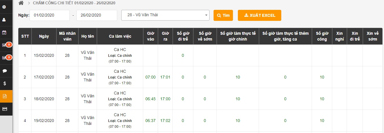 Báo cáo chi tiết dữ liệu chấm công của từng nhân viên trong một khoảng thời gian cụ thể, nếu muốn xem theo tháng bạn chọn từ ngày đầu tháng đến cuối tháng.
