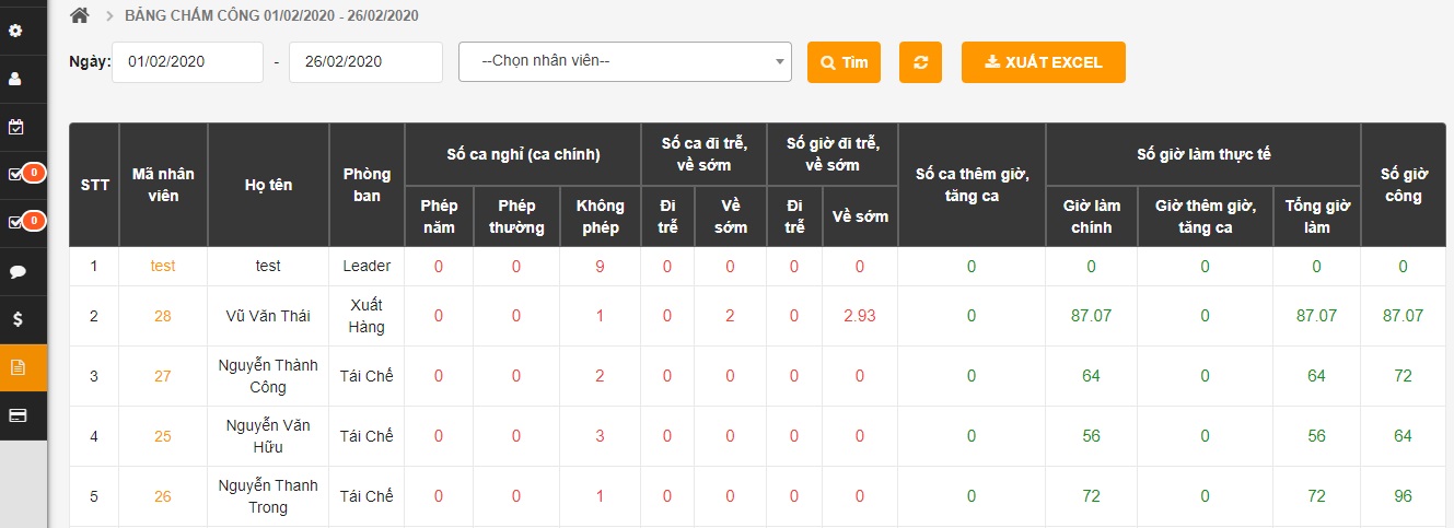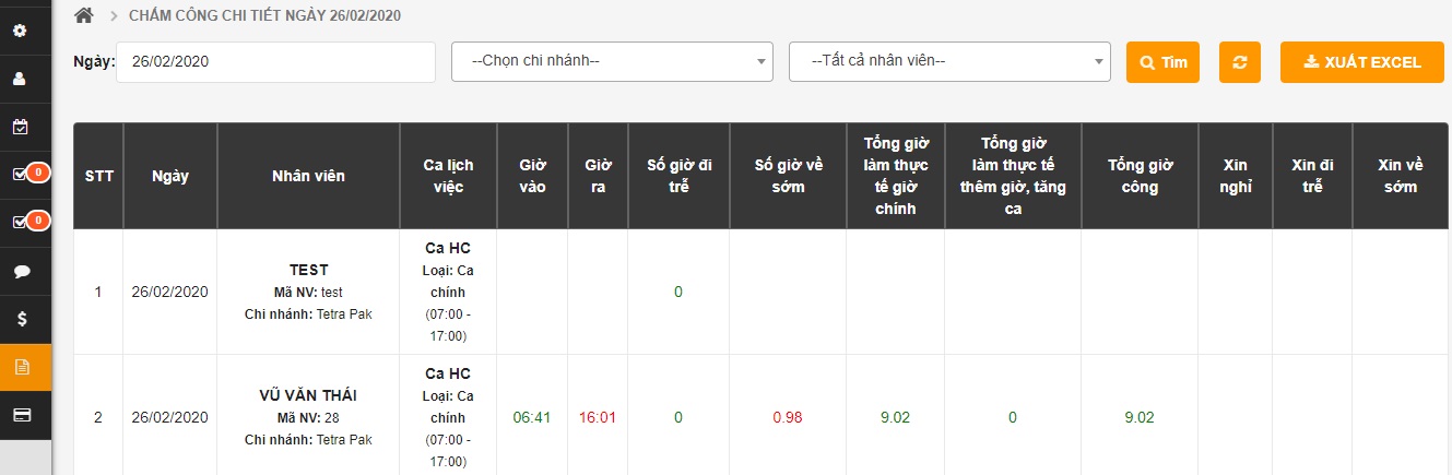 Tất cả thông tin chấm công trong này được hiển thị chi tiết tại màn hình này. Giờ được tô đỏ là trường hợp đi trễ hoặc về về sớm, màu xanh là đi làm và ra về đúng giờ.