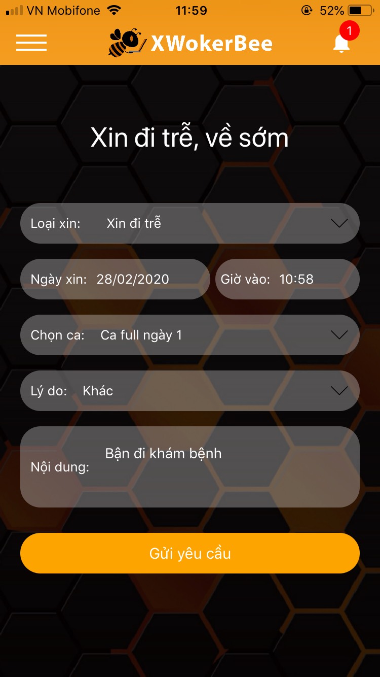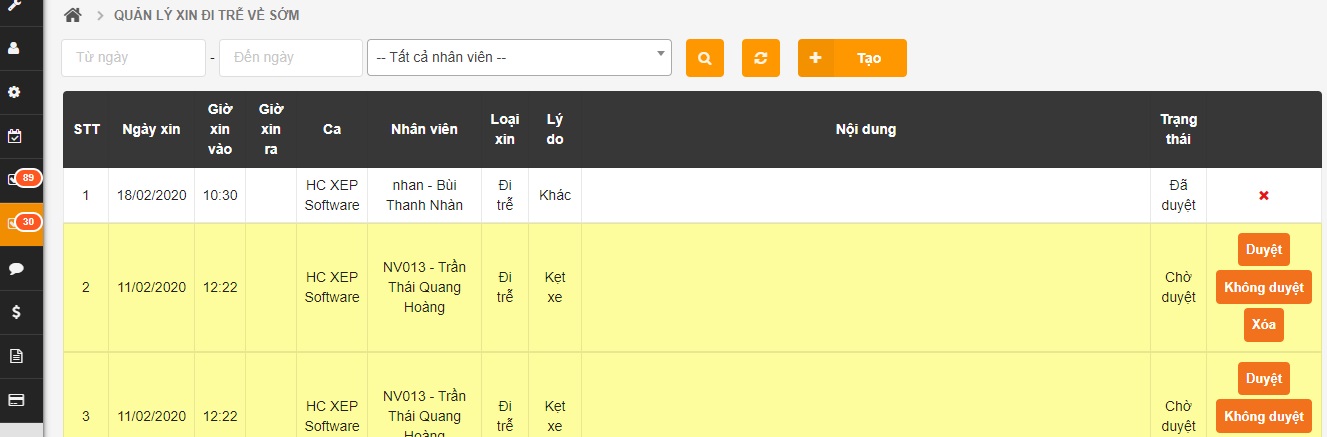 Nhân viên sử dụng app để xin đi trễ hoặc về sớm, admin sẽ nhận thông tin tại màn hình này và tiến hành duyệt cho nhân viên.