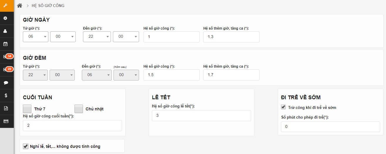 Mặc định hệ thống tự sinh ra hệ số cơ bản dựa trên luật lao động và theo những trường hợp sử dụng phổ biến nhất, bạn có thể điều chỉnh lại hệ số theo nhu cầu riêng của doanh nghiệp mình.
