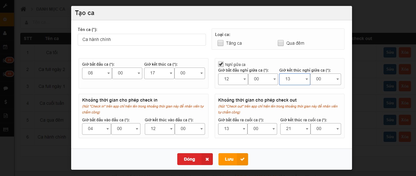 - Khoảng thời gian cho phép check-out: Tương tự khoảng cho phép check-in, ngoài khoảng thời gian này nút check-out của ca không được hiện lên trên app