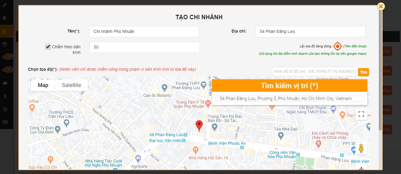 Chi nhánh chính là địa điểm chấm cong của nhân viên, mỗi chi nhánh bạn cần nhập tọa độ và bán kính cho phép, nhân viên chỉ có thể chấm công khi đứng trong phạm vi bán kính cho phép tính từ tọa độ được được cài đặt trên bản đồ này.