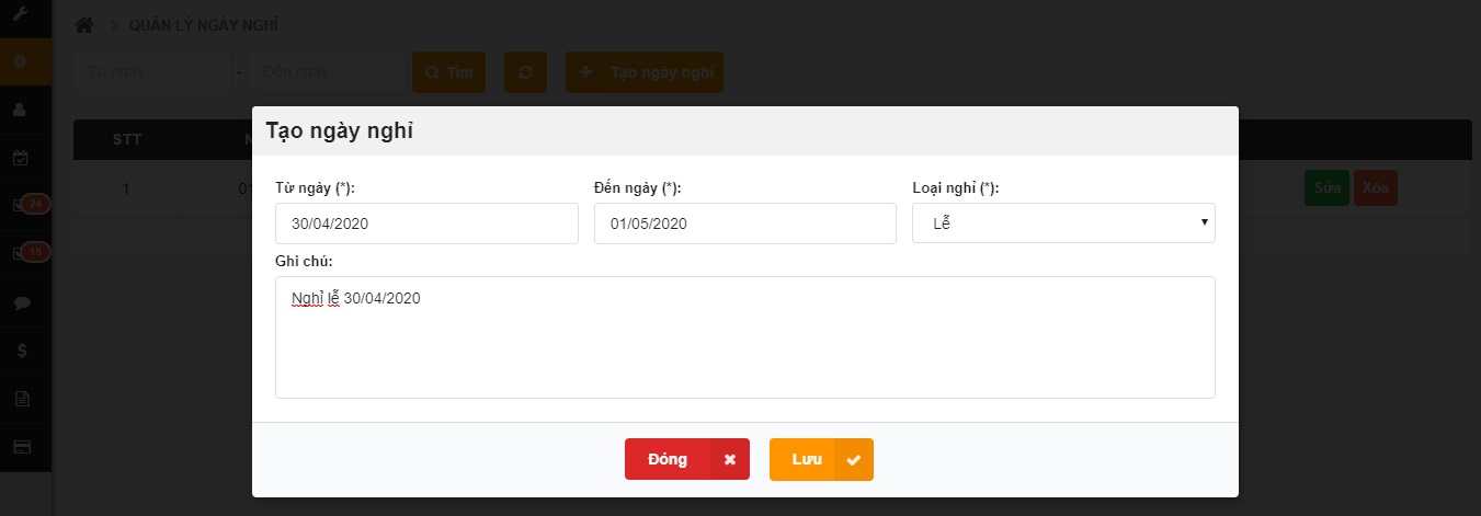 Ngày nghỉ bao gồm những ngày lễ, tết, hoặc dịp đặc biệt nào đó. Khi bạn tạo ngày nghỉ thì nhân viên được phân công làm việc vào những ngày này sẽ nghỉ mà vẫn được tính giờ công đầy đủ.