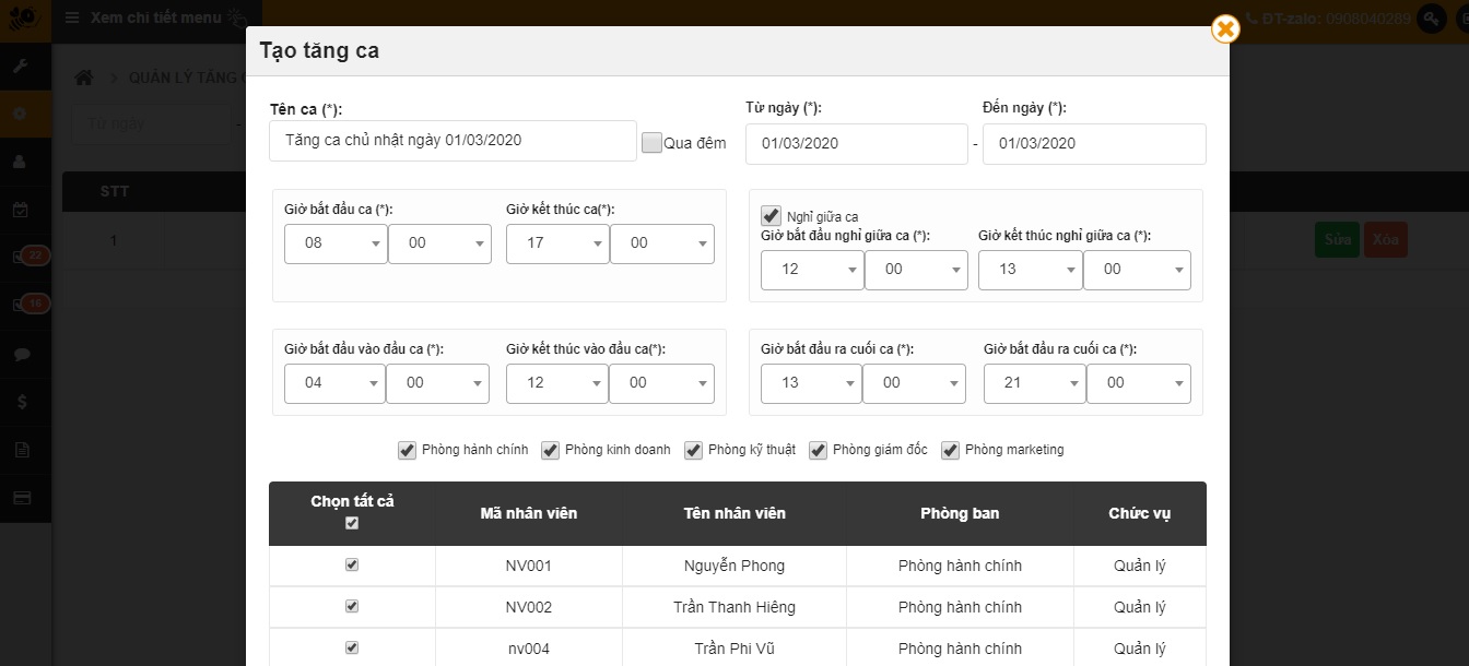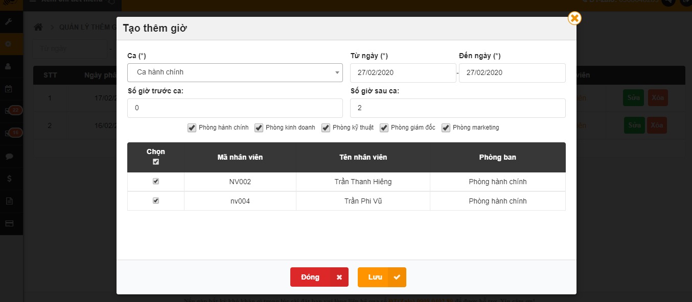 - Tăng ca: Giúp quản lý có thể phân công tăng ca từ đâu mà không phải tạo lại khi phát sinh một tăng ca mới