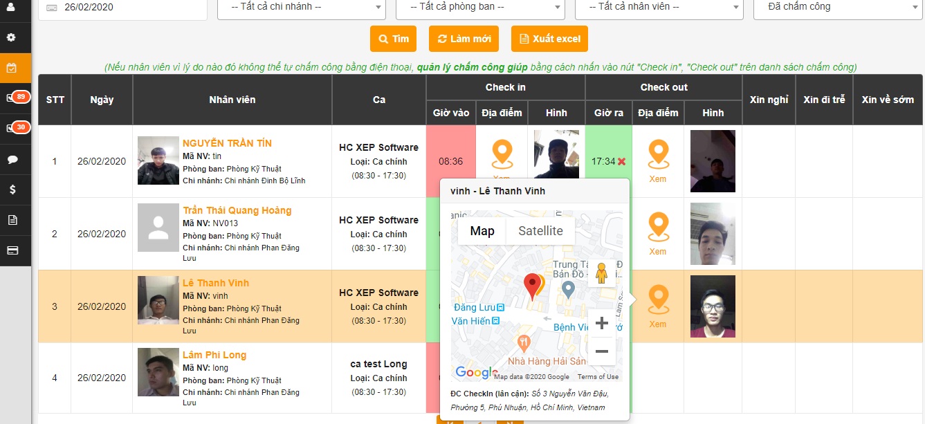 Nhân viên chỉ có thể chấm công trong phạm vi admin cho phép, lúc chấm nhân viên phải chụp ảnh khuôn mặt bằng camera trước để admin có thể xác thực người chấm.